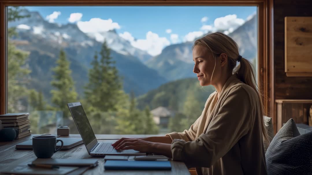 AI Generated Image. Video clip showing young woman typing on laptop at wooden desk inside mountain cabin, wearing earbuds and lightweight sweater, looking focused and calm. Large panoramic window framing forest and snow-capped peaks, natural light flooding interior and creating warm, inviting mood. Desk featuring coffee mug, stacked notebooks, smartphone, offering authentic remote workspace details and everyday routine feel. Camera holding steady, moderate depth of field keeping subject sharp while softening distant landscape, delivering cinematic yet usable footage. Suited for lifestyle campaigns, remote work tutorials, corporate recruitment, travel and retreat promos, wellness and work-life balance stories, website hero headers, social media reels, and B-roll for documentaries. Editing-friendly clip for adding voiceover, ambient audio, or motivational soundtrack, and for pairing with text overlays about productivity, flexible work, or nature-based coworking experiences.