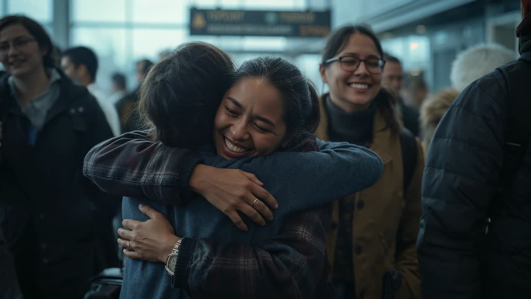 AI Generated Video. Video showing two women reuniting with warm hug after arrival at busy airport terminal. Camera capturing tight embrace, smiling faces, and movement of surrounding crowd. Background featuring blurred arrival signage and passengers in transit, creating sense of travel and reunion. Color palette using cool natural light and soft contrast for documentary, handheld feel. Clip working well for airline marketing, tourism websites, airport service promotions, social media posts about homecoming and friendship, emotional storytelling, welcome campaigns, and lifestyle branding. Editing suggestions: use close-up of faces for hero shot, cut to wide shot for contextual scene, create looped short clip for vertical reels and web banners. Text overlay placement recommended at upper left or lower third to preserve main action. Aspect ratios suitable for 16:9 hero banners, 1:1 social posts, and 9:16 mobile reels. Emotional tone fitting customer testimonial pages, loyalty program ads, travel blog headers, and charity or community outreach content. Talent appearing natural and diverse; do not infer identity or personal details.