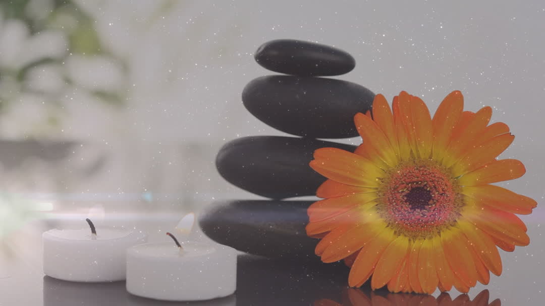 This peaceful and serene scene depicts a zen ambiance with smooth black spa stones stacked beside an orange flower and softly glowing candles. The animation of light spots enhances the calming vibe, making it perfect for spa advertisements, wellness blog posts, or relaxation content. Ideal for businesses promoting aromatherapy, natural beauty products, or meditative techniques.