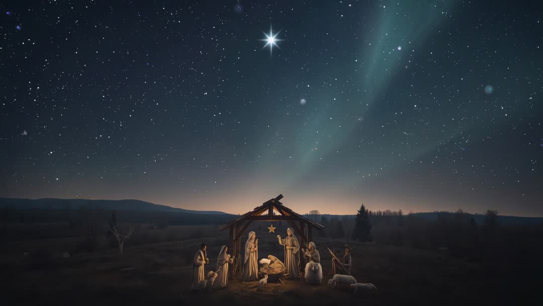 AI Generated Image. Camera zooming slowly toward rustic stable, revealing infant resting in manger while robed visitors and shepherds gather in warm glow. Bright star placing beam of light over stable, aurora and starry sky stretching across wide horizon for cinematic contrast. Soft, warm center lighting highlighting faces and animals, while cool blue tones defining night landscape. Featuring AI-generated digital art style with polished, painterly atmosphere. Working well for Christmas campaign hero videos, church sermon openers, holiday greeting animations, social media reels, educational clips about nativity, seasonal event promos, religious documentary b-roll, or background for title cards and overlays. Supplying calm, reverent mood and strong visual focus perfect for storytelling and seasonal marketing.