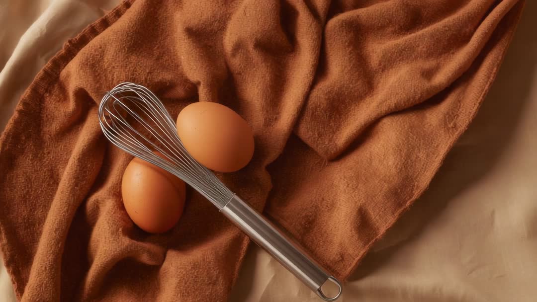 AI Generated Video. Video showing gentle zoom tightening frame on whisk and two brown eggs resting on crumpled linen towel over beige countertop. Camera capturing fabric texture and whisk wire detail under warm natural light, composition using shallow depth of field and soft shadows to create cozy, rustic mood. Serving as opener for cooking tutorials, recipe reels, baking process videos, culinary product promos, kitchen utensil demonstrations. Working well for food blogs, Instagram reels, YouTube thumbnails, website hero banners, packaging mockups, cookbook background plates. Providing visual texture for textile or home goods marketing and color palette references, evoking homestyle cooking and morning ritual ambience. Fitting stock footage libraries and motion design projects requiring slow, sensory detail and warm, neutral palette.