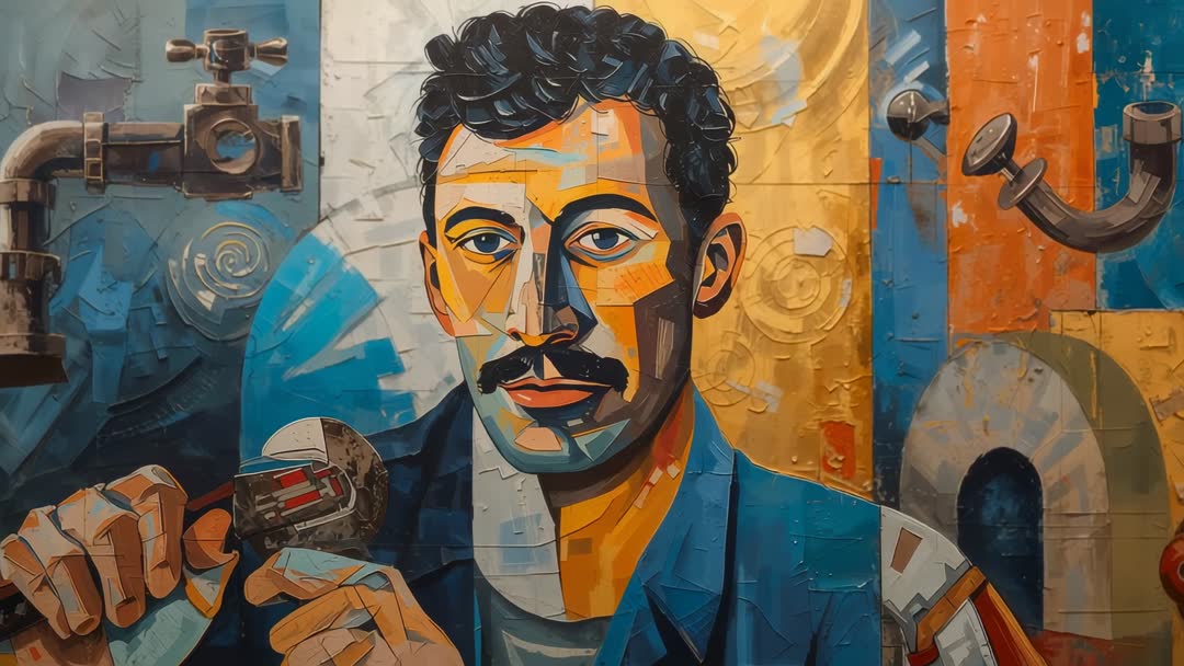AI Generated Image. Video clip zooming from wide view into close-up of mural portrait of plumber holding wrench, revealing layered brushstrokes and textured colorblock panels. Bold palette of blue, gold, orange creating dramatic contrast and strong graphic impact. Geometric facial planes and stylized mustache adding character and nostalgic mood. Camera movement creating cinematic reveal ideal for opening title, craft documentary, trade business promo, or gallery reel. Use cases: background for website hero, social media clip, video bumper, company branding, editorial illustration for feature on urban art or skilled trades. Licensing suggestions: commercial use for advertising, editorial use for art stories, broadcast use for documentary segments. Cropping notes: crop-safe center on face and hands, loop-friendly end frame on wrench. File suggestions: export short loop for Instagram reels and TikTok, extract high-resolution stills from clip for print banners and poster art.