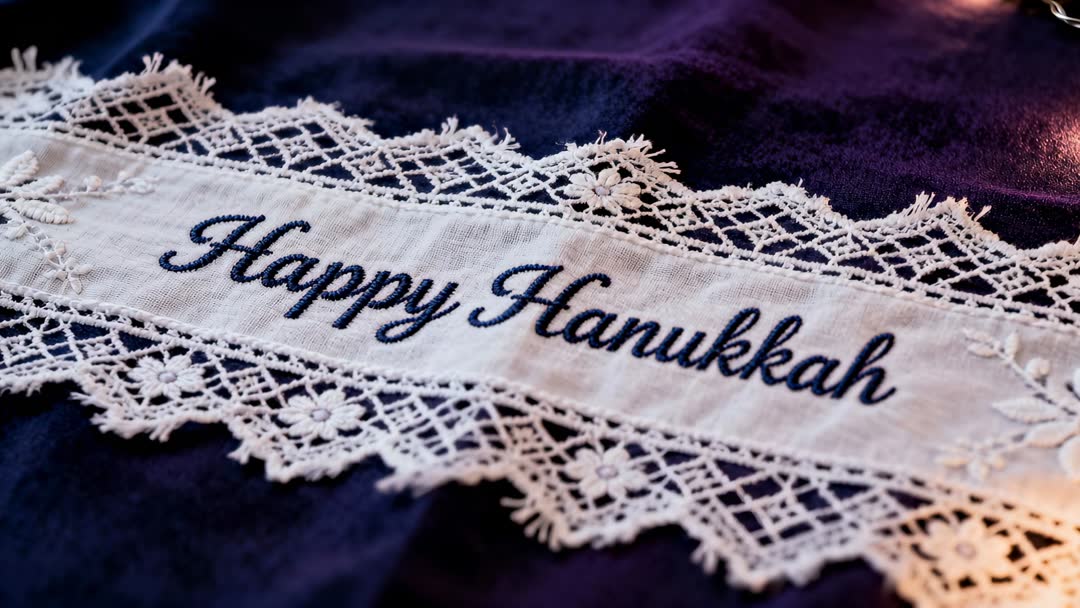 AI Generated Image. Providing intimate close-up of embroidered Happy Hanukkah ribbon resting on deep navy linen with delicate lace edging and warm candlelight bokeh. Highlighting fine needlework, textured linen weave, and handcrafted charm for festive storytelling. Working well for holiday greeting video loops, social media reels, e-card introductions, website headers, email campaigns, printed cards, and product packaging. Pairing with menorah visuals, gift-wrapping tutorials, event invitations, and community celebration content. Suggesting crop for rule-of-thirds composition, adding soft piano soundtrack, and looping for short-form promotional clips. Supporting Jewish holiday marketing, synagogue event promotion, community announcements, and family greeting messages.