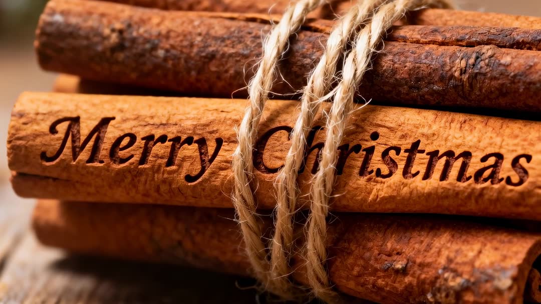 AI Generated Video. Video showing camera slowly zooming in on cinnamon sticks engraved with 'Merry Christmas' and tied with jute twine on worn wooden board. Warm lighting highlighting textured bark and natural fiber details, with shallow depth of field creating soft background bokeh. Macro framing revealing crisp engraved lettering and rich surface texture of spice sticks. Serving holiday marketing, boosting seasonal social media posts, enhancing gift wrap tutorials, complementing recipe and baking videos, animating greeting card content, dressing product packaging, anchoring website banners and e-commerce hero frames. Color palette featuring warm amber, cinnamon brown, beige and soft highlights for cozy festive mood.