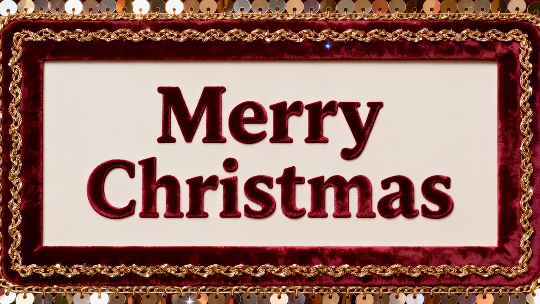 AI Generated Video. Video clip showing camera zooming in on Merry Christmas lettering embroidered on cream panel, framed by deep red sequined velvet and braided gold chain trim. Close-up capturing rich plush texture, sequined sparkle, and gleaming metallic highlights. Mood conveying classic holiday glamour, warm festive glow, and luxury gift display. Perfect for holiday marketing, banner ads, website headers, social media reels, retail window promotions, greeting card intros, and seasonal event openers. Suggested edits including looping short zoom for hero banners, adding animated snowfall overlay, applying warm color grade, and placing bold text or logo in empty cream space. Suitable for 4K, 1080p, square and vertical crops, and easy integration into festive campaign packages.