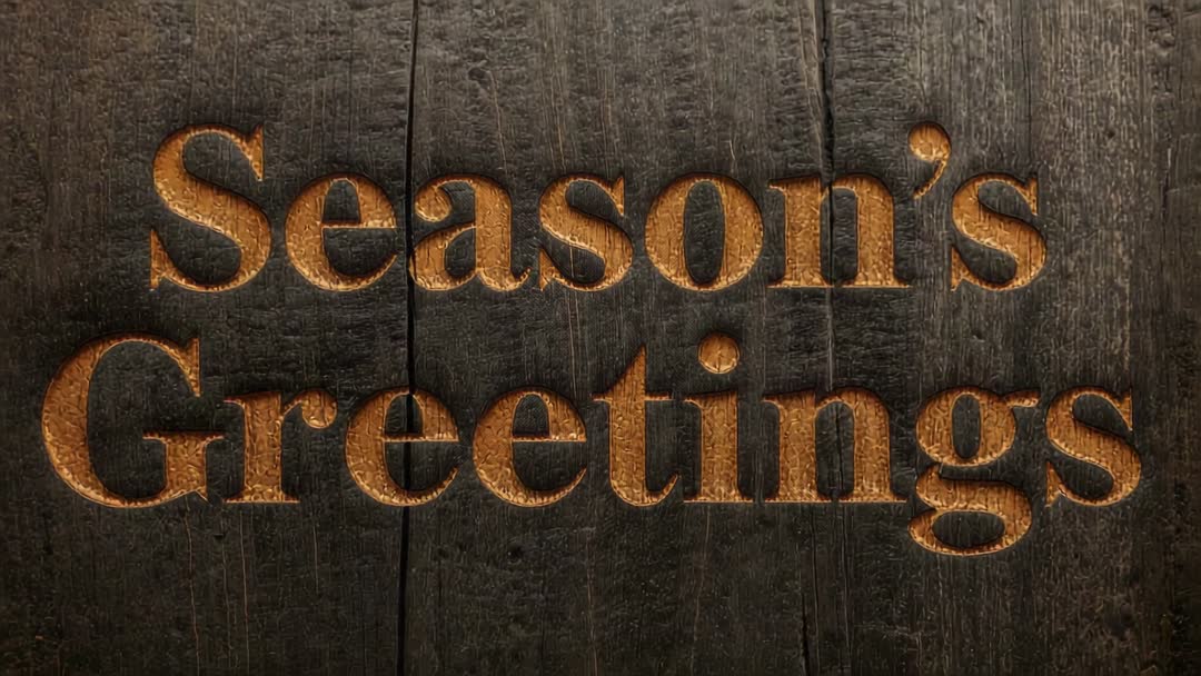 - Zooming into engraved gilded Season's Greetings on dark wood, warm lighting, serif typography