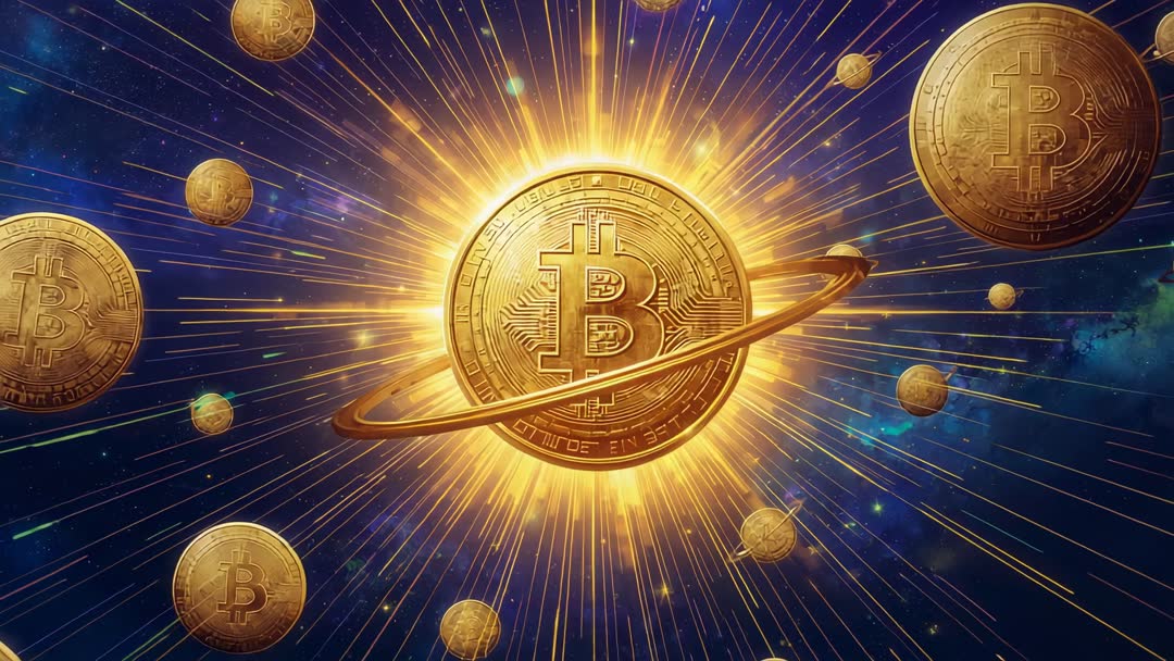- Zooming into Golden Bitcoin Sun with Orbiting Ring and Radiant Circuitry in Cosmic Space