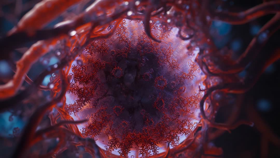 AI Generated Image. Showing camera zooming through dense filamentous network into translucent spherical globule surrounded by branching vascular-like tubes. Surface being covered in beadlike droplets and fine filaments, with deep red and cool blue lighting creating cinematic contrast and shallow depth. High-detail 3D render offering close-up exploration of cellular, viral, and microscopic biology concepts for scientific explanation and visual storytelling. Suited for use in medical presentations, educational explainer videos, biotechnology marketing, laboratory website headers, documentary sequences, and social media motion clips. Licensing suggestions including editorial science, pharmaceutical campaign, conceptual tech, and health awareness materials.