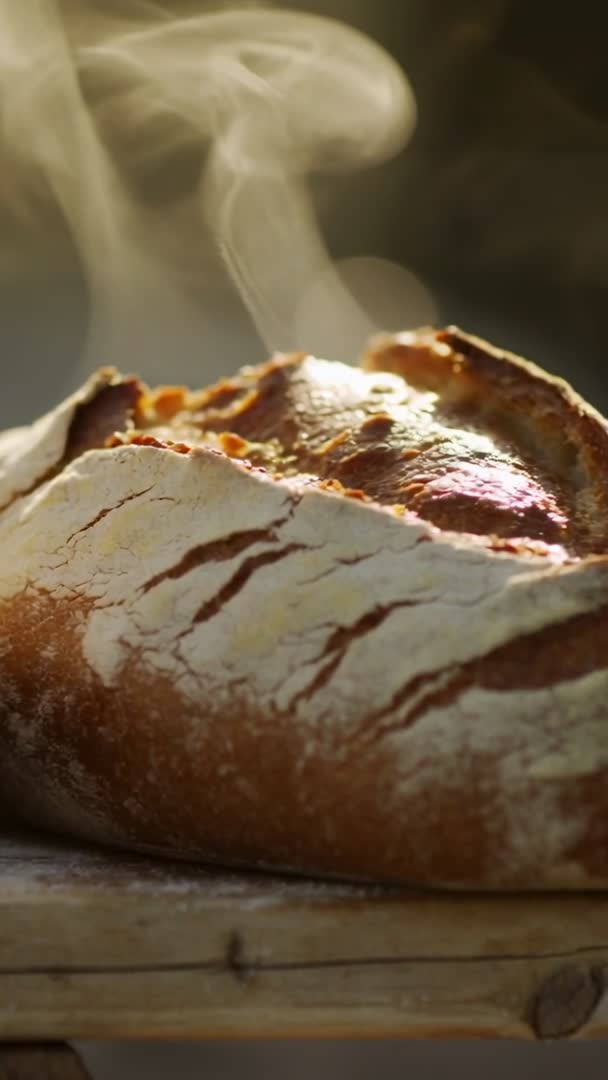 AI Generated Image. Vertical video showing close-up of steaming artisan sourdough loaf resting on wooden plank, highlighting flour dust and deep crust scoring. Warm natural light reflecting off golden crust, shallow depth of field creating soft background bokeh. Texture detail and rising steam conveying oven-fresh warmth and rustic bakery atmosphere. Suggested uses: Bakery website hero, social media story or reel, recipe video intro, cooking channel thumbnail, menu background, product packaging mockup, promotional ad for artisan bread or bakery classes, food blog header. Suitable for commercial food advertising, editorial culinary features, and lifestyle content. Use space in top third for text overlay or logo.