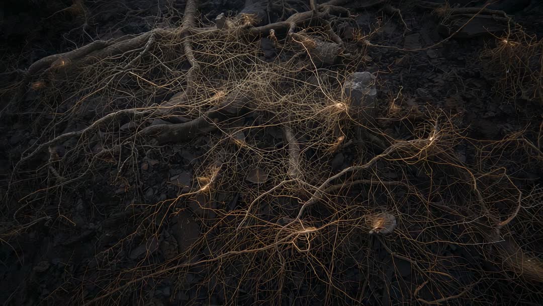 AI Generated Image. Zooming over tangled forest root network glowing with amber bioluminescent nodes, camera movement revealing intricate filaments and pulsing junctions suggesting underground signal flow. Cinematic low-light palette combining warm amber highlights with cool shadowed soil, creating moody atmospheric contrast. Evoking themes of communication, mycorrhizal networks, neural connectivity, and data flow between organic systems. Working well for science explainer videos, ecology documentaries, technology and AI presentations, neural network metaphors, environmental campaign visuals, music visualizers, and immersive installation loops. Allowing easy cropping for vertical or square formats, useful as opener, loopable background, transitional sequence, or layered element in motion design and branding projects.