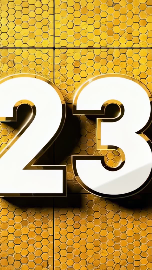 AI Generated Video. Zooming camera revealing glossy 3D digits 23 set against gold hex honeycomb panels, light glinting across metallic surfaces while deep shadows are creating strong depth. Vertical 9:16 clip offering high-contrast white numerals with gold trim and reflective highlights, designed for looped playback and quick edits. Use for sports number reveals, player intros, countdown sequences, birthday or anniversary promos, product launches, luxury brand spots, Instagram Stories, TikTok and YouTube Shorts. Pairing with punchy percussion or cinematic brass sound enhancing impact, while layering text or logo over shadowed areas supporting clear branding. Providing easy color grading and speed adjustment for matching project palette and tempo.