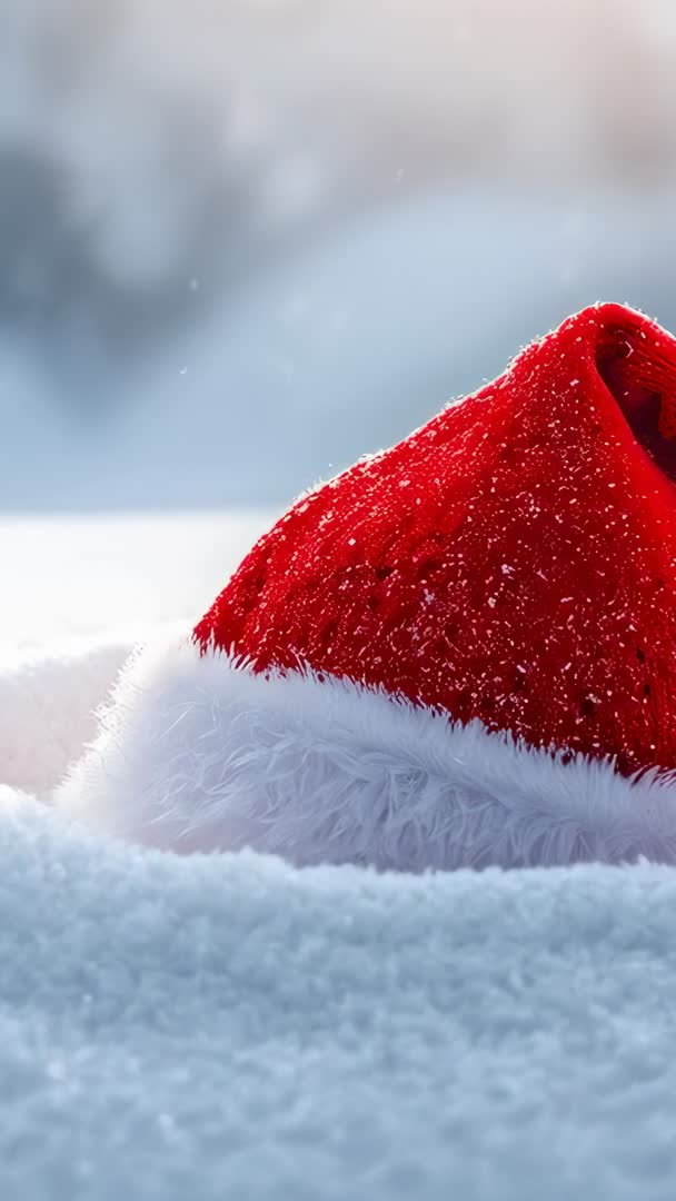 AI Generated Video. Showing red Santa hat lying in fresh snow while delicate flakes falling and soft bokeh blurring background. Featuring close-up vertical composition, creating cinematic feel and textured detail of red felt and white fur brim contrasting with cool blue snow. Suited for social media stories, holiday ads, seasonal greetings, website hero banners, email headers, and retail promotions. Editing suggestions: applying gentle slow zoom and subtle vignette, adding warm music or sleigh bells, overlaying short seasonal text or logo in top or bottom safe area, looping clip for background ambience. Conveying cozy, festive, peaceful, magical mood; color palette focused on red, white, cool blue-gray. Using for Christmas campaigns, winter product shots, holiday countdowns, event invitations, seasonal marketing, and festive overlays or transitions.