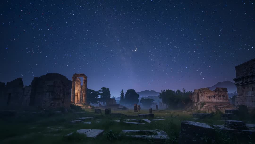 AI Generated Image. Camera zooming through starlit ancient ruins, revealing illuminated stone arch under crescent moon and drifting mist. Shot combining cool blue moonlight with warm architectural lighting for cinematic contrast and moody atmosphere. Providing strong foreground detail with scattered stone slabs and soft midground fog for layered depth. Ideal for opening sequence in historical documentary, travel film, fantasy trailer, or game cinematic. Suitable for website hero banner, title card, social media short, book cover, museum exhibition loop, or background loop for meditation and astronomy content. Color grading friendly for teal-orange or moody blue looks. Shoot suggestions: slow zoom or dolly prolonging reveal, subtle lens flare on illuminated arch, long exposure for enhanced star detail. Licensing ideas: heritage tourism campaign, cultural storytelling, mystical scene, or atmospheric advertising.