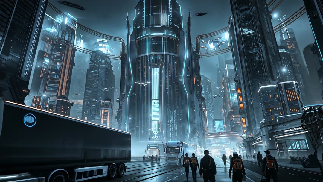 AI Generated Image. Showing camera zooming through neon-lit metropolis toward towering central tower, commuters walking along wet avenues, heavy trucks moving on slick lanes, drones hovering between skyscrapers, fog drifting through illuminated corridors. Scene conveying high-tech urban atmosphere, cyberpunk aesthetic, moody blue-orange color palette, cinematic depth and large-scale vertical architecture. Clip serving well as cinematic opener, technology brand promo, smart city concept video, futuristic transport presentation, game trailer background, or editorial illustration for urban innovation and AI-driven mobility stories. Suggested uses include serving as website hero background, powering title sequence, enhancing social media ad, supporting corporate presentation, and illustrating feature article. Adding slow push-in zoom, layering ambient synth soundtrack, applying teal-and-orange color grading, and placing bold headline text overlay will amplify cinematic impact.