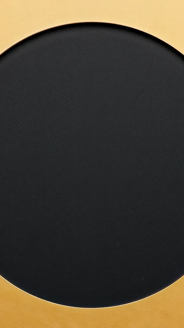 AI Generated Video. Vertical video showcasing smooth zooming camera revealing textured matte black circular panel framed by warm gold rim. Composition emphasizing strong contrast and generous negative space while highlighting tactile surface detail for premium look. Visuals working well for luxury branding, product reveal, cosmetics and jewelry campaigns, tech hero clips, and event promotions. Creative uses include vertical ad background, social media story, mobile wallpaper, title card, and product showcase. Footage supporting center text overlay, animated logo, lower-third copy, and call-to-action. Recommend slow zoom, subtle vignette, and warm color grade to enhance gold tones. Provide easy cropping for square or landscape campaigns while retaining gold rim accent.